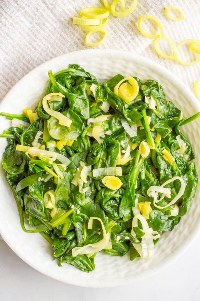 Sautéed spinach and leeks Sautéed spinach and leeks is a quick + easy, healthy dish with simple ingredients and delicious flavor! | www.familyfoodonthetable.com Sautéed spinach and leeks is a quick + easy, healthy side dish with simple ingredients and delicious flavor!